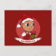 Cartão-postal com uma ilustração de uma menina ou rapaz feliz sorridente e fofo, o bebê está vestindo roupas vermelhas e brancas e segurando um presente; com um modelo de texto editável para seu nome ou mensagem, design de Natal com fundo vermelho