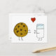 Cartão postal de amor de biscoitos por leite, com um adorável biscoito de gotas de chocolate estendendo a mão para um copo de leite, e um grande coração vermelho acima deles.