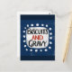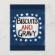 Um design tipográfico divertido e fofo de comida sulista que diz "Biscoitos e Molho". Tem texto preto e vermelho em um retângulo branco com pontos brancos funky e divertidos ao redor, tudo em um fundo azul.