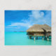 Cartão postal de um bangalô de mel sobre a água e com um telhado achatado na lagoa azul-turquesa da ilha tropical de Bora Bora, perto do Taiti, na Polinésia Francesa.
