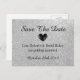 Cartão postal de casamento Save the date com brilho prateado falso e símbolo de coração preto desgastado pelo tempo. Ótimo para lembrar os convidados do seu casamento luxuoso e sofisticado. Nome do noivo e da noiva personalizável com texto de tipografia elegante e sofisticada. Design sofisticado com textura de fundo prateado e brilhos / faíscas falsas. Cartões luxuosos.