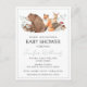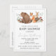 convite de chá de bebê com tema de aquarela da floresta com animais: urso, raposa, cervo, ouriço, cogumelos e folhas da floresta