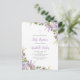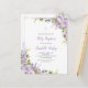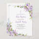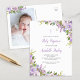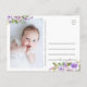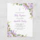 Barato com impressão personalizada de uma menina Baptism. Este bonito design feminino tem uma borda floral de cor d'água com flores roxas pastel e verde. Personalize a design com os detalhes da festa Baptism do seu filho. O verso tem espaço para uma fotografia com o seu endereço de devolução impresso para facilitar a correspondência. Clique em Personalizar para escolher qualquer cor de fundo e editar as fontes e cores do texto para criar um convite exclusivo de Natal para a sua bebê.