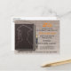 Cartão-postal para a celebração da graduação, com um tema de livro que retrata um chapéu de toga e uma caneta ao seu lado, num fundo de madeira