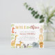 Celebre a aniversário de 3 anos do seu filho com estes bonitos convites de aniversário temidos para animais da selva. Apresentando uma girafa, uma raposa, um pássaro, um esquilo, um elefante, um leão, um coelho e um urso com folhas verdes entre os diferentes elementos. As palavras "WILD & TRE" são exibidas em uma tipografia manuscrita caprichosa. Invertendo a um fundo amarelo doce com pontos desenhados à mão que se assemelham ao padrão da girafa na frente.