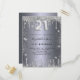 Um convite moderno, na moda e glamouroso para um aniversário de 21 anos. Um fundo com aparência de prata falsa, decorado com poeira brilhante. Personalize e adicione o seu nome e detalhes da festa. O número 21 é escrito com uma fonte de estilo balão, script. Traseira: metálico prateado, design postal. Dica: Se você não quiser que pareça um cartão postal, clique em personalizar, vá para o verso e remova o divisor e o carimbo de posto.