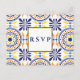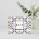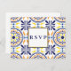 Este postal de RSVP de casamento inspirado no Mediterrâneo apresenta bordas de azulejos tradicionais espanhóis extravagantes e elegantes em amarelo e azul naval.