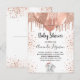Para um chá de fraldas, comemorando uma menina. Um fundo branco chic. Decorado com rosa dourado, brilho rosado, pintura pingando, balões e uma menina elefante de bebê. Personalize e adicione o nome da futura mãe e os detalhes da festa. O nome e o texto: Chá de fraldas são escritos com um script de estilo com letra manual. Fundo: fundo branco, gotas de brilho, design de cartão-postal. Dica: Se você não quiser que pareça um cartão postal, clique em personalizar, vá para o verso e remova o divisor e o carimbo de posto.
