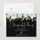 Certifique-se de que todos os seus amigos e parentes ainda poderão celebrar o marco da Bat Mitzvah de sua filha, independentemente das atuais circunstâncias globais imprevistas. Envie este cartão-postal de "Mudança de Planos" personalizado e elegante. Uma aquarela floral branca e dourada brilhante, chic e deslumbrante, com tipografia de texto em falso foil dourado e tipo sans serif branco sobrepõe um fundo preto dramático. Personalize o texto personalizado com o nome e a data da Bat Mitzvah. Sua mensagem personalizada, uma Estrela de Davi dourada e seu endereço de retorno adornam o verso. Certifique-se de que a celebração especial dela ainda será tão festiva quanto o planejado originalmente!
