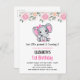 Convite de aniversário com uma ilustração de aquarela de elefante rosa giro. Ela tem orelhas bonitinhas, cor-de-rosa e bolinhas branca e arco bonito de fita rosa sobre a cabeça. O topo é decorado com um belo buquê de rosa.