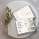 Adicione este cartão postal RSVP exclusivo ao seu papel de carta de Convite. Este design apresenta eucalipto e folhagem em verde-sábio e bege pintado em aquarela. No sentido inverso está o espaço para o seu convidado responder e o seu endereço de retorno.