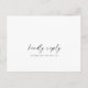 Este cartão postal de RSVP, pedido de música moderna, é perfeito para um casamento minimalista. O simples design preto e branco apresenta uma tipografia industrial única, com estilo boho moderno. Personalizável em qualquer cor. Mantenha o design mínimo e elegante, como está, ou personalize-o adicionando seus próprios gráficos e trabalhos de arte. Crie sua lista de convidados de casamento e sua lista de músicas de dança de uma só vez! Este cartão de resposta do casamento convenientemente pergunta aos hóspedes se eles serão capazes de ir ao seu casamento, e também que música os fará dançar.