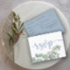 Cartaz Rsvp de casamento simples e moderno com tipografia elegante em azul empoeirado sobre fundo branco, com adição de folhagem de aquarela de eucalipto. Personalize com facilidade.