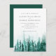 Se você quiser celebrar seu casamento com uma comemoração ao ar livre, este convite de casamento será ideal para você. Apresentando floresta aquarela com pinheiros no fundo. Seus detalhes são mostrados em uma tipografia serif clássica. Inverter para uma cor de fundo verde profunda.