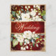 Pulveridades florais botânicas brancas e verdes lindas com roteiro de "Casamento" no centro sobre lindos fundos russos vermelhos. Este é um adorável convite de cartão postal. Amarrou-se na falsa brilha do ouro para dar o tom à elegância romântica e clássica. Douradas malhas terminam este bonito cartão postal de convite para casamento. Bonita para qualquer estação.