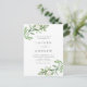 Crie um convite bonito e eterno com nosso cartão postal de convite para casamento, com uma delicada cor d'água verde e flores brancas design. Este convite elegante e inspirado na natureza é perfeito para casamentos de jardim, rústicos ou ao ar livre, acrescentando um toque sereno e romântico ao seu dia especial. Personalize este cartão postal de convite para casamento verde adicionando seu texto ao ajustado do seu tema de casamento e detalhes, garantindo uma primeira impressão única e memorável para seus convidados. Quer você esteja hospedando um casamento de jardim ou simplesmente adorar a beleza do verde e das flores, este convite de casamento de aquarela personalizável adiciona um toque da natureza à sua celebração.