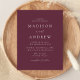 Cartaz de convite para casamento minimalista e moderno com detalhes de seu casamento em letras brancas com sotaques de escrita de caligrafia. O fundo púrpura de vinho pode ser mudado para uma cor de sua escolha. Personalize a parte de trás do cartão postal do convite de casamento com seu endereço de volta, site do casamento, imagens, etc. Projetado para coordenar com a nossa coleção de casamento do Modern Elegance.