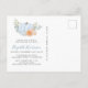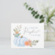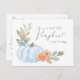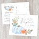 Um cartão-postal de convite para um chá de bebê bonito com "A Sweet Little Pumpkin Is On Your Way" escrito em uma mistura de tipografia azul-clara moderna e um roteiro de na moda com um inchaço cardíaco, e um buquê de aquarela de uma abóbora azul pastel, florais laranja e verde. No verso, personalize facilmente o nome da mãe em um roteiro azul moderno e os detalhes do chá em uma simples tipografia de cinzas mole.