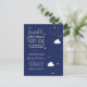 Convite de chá de fraldas Whimsical com as palavras "estrela cintilante" numa tipografia moderna, manuscrita, com estrelas amarelas flutuando ao redor com nuvens ao lado contra fundo azul-da-meia-noite.