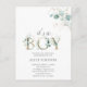 Celebre sua alegria com nosso convite personalizado de cartão postal de chá de fraldas. O anúncio "É um" flui graciosamente na escrita moderna, culminando na risonhante serifa "Boy", todos gostosamente enfeitiçados com folhas de eucalipto. Oferecendo estilo e preço acessível, este cartão é uma escolha econômica para sua ocasião especial. Por favor, note: para manter o seu caráter favorável ao orçamento, não são fornecidos envelopes. Assegure-se de que é o ajustado perfeito para a sua celebração e se prepare para receber seu bebê em estilo!