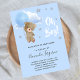 Para um chá de fraldas celebrando um menino. Um fundo azul com estrelas. Um ursinho de pelúcia segurando um balão azul claro. Personalize e adicione o nome da mãe a ser e os detalhes da festa. O nome e o texto: Oh Boy! são escritos com um estilo escrito à mão. Fundo: fundo azul, design postal. Dica: Se você não quiser que pareça um cartão postal, clique em personalizar, vá para o verso e remova o divisor e o carimbo de posto.