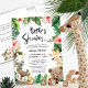 Cartão de Convite para Chás de fraldas Tropical Verde Tropical Selgle Safari Animal. Celebre a chegada do seu bebê precioso com este cartão de convite festivo, chico e bonito. Todos os textos estão pré-organizados para que você personalize fácil e rapidamente com os detalhes do seu chá de fraldas.