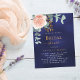 Um fundo azul marinho colorido. A cor azul é irregular. Decorados com ouro-rosa e folhas de eucalipto cor-de-rosa-esbranquiçada, flores de rosa e cor-de-rosa-esbranquiçada, galhos, verde-verde e um cinzeiro de ouro falso. Personalize e adicione o nome da noiva a ser e os detalhes da festa. Texto branco e ouro.