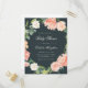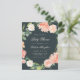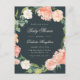 Convite para chá de fraldas floral primavera com cor-de-rosa-pincel e cor-de-água de pêssego e rosas com verde-eucalipto esmagado sobre fundo cinza escuro.