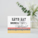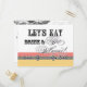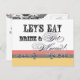 Fontes elegantes e divertidas anunciam a mensagem, "Vamos come, bebe e se casa!" em um maravilhoso cartão postal de Chá de panela caprichoso. Numa paleta de cores clara, nítida e nítida, ouro mostarda, pêssego, cinza, preto e branco, é o melhor da safra com uma reviravolta moderna. Adicione seu Chá de panela facilmente ao reverso.
