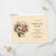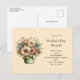 Mother's Day brunch postcard invitation with a cute image. Blue. pink and cream colored flowers with green leaves. Set inside a green flower pot with a green plaid cloth hanging over the side.