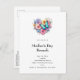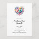 Birthday party invitation postcard with a beautiful illustration. A heart-shaped bouquet of flowers in pastel blue, green, purple and yellow. With a lovely blue butterfly hovering in front.