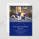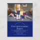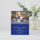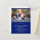 Convite de casa nova com texto personalizável. A foto é um modelo e deve ser trocada pela sua. O cartão-postal tem fundo azul e texto branco.