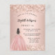 Um convite moderno, na moda e glamouroso para uma doce festa de aniversário 16, 16. Um fundo rosa de ouro com poeira falsa de ouro, uma garota vestindo um vestido de bola. O nome é escrito com um moderno estilo escrito à mão. Personalize e adicione os detalhes da sua festa.