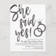 Celebre seu novo noivado com um janto de noivados quente e convidativo entre amigos. Este convite contém as palavras "Ela disse sim!" em letras rico. Perto deste lado estão dois anéis de casamento. Abaixo deste gráfico único está um espaço para suas próprias palavras e informações para seu evento de pré-casamento. O lado inverso contém um espaço para o seu endereço e uma mensagem exclusiva para o seu convidado de futuros participantes.