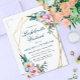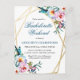 Flores de cor aquosa, cor-de-rosa e branco, de cor azul-claro, dentro de uma estrutura dupla geométrica dourada, apresentam floreios botânicos e de bagas. Personalize este elegante cartão-postal itinerário de convite de fim de semana de bachelorette floral boho com suas próprias cores e fontes ou mantenha esta tipografia popular como é para sua conveniência. MIx e combinar com outros itens nesta bela coleção de casamento.