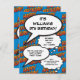 Personalize com o nome da aniversariante ou do garoto e todos os detalhes da festa. Um divertido, azul, legal e moderno convite de aniversário inspirado na pop de revista em quadrinhos, que coloca o wham, zap, pow em qualquer evento de celebração de aniversário de um super-herói. Desenvolvido pela ComicBookPop © em www.zazzle.com/comicbookpop*