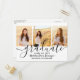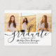 Anuncie um segundo grau ou formandos e convide a família e os amigos a celebrarem com cartões postais personalizados de convite de festas de colagem de 3 fotos. Todas as imagens e textos são simples de personalizar e as cores são fáceis de mudar com a ferramenta design Zazzle. Este modelo é configurado como um cartão de anúncio combinado e um convite de festas que pode ser personalizado com quaisquer detalhes de sua escolha, como nomes de pais, honras especiais, título de grau, citação inspiracional favorita, planos futuros de formandos ou novo endereço. O design a preto e branco apresenta um boné de conselho de argamassa, caligrafia moderna com script de tendência, tipografia elegante minimalista e três fotos favoritas, como fotos de mais velho ou imagens da cerimônia de inauguração. Este cartão de formatura é uma na moda para anunciar uma celebração especial de dia. Parabéns ao formando!