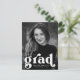 Cartões postais de convite de festa de formatura em negrito com a fotografia vertical do formando com "formando" em caracteres brancos a negrito. Personalize os convites para festa de formatura de fotos adicionando o nome do formando, o ano de graduação e a escola. O convite de festa de formatura do cartão-postal reverte para exibir seu endereço de devolução e detalhes da parte.