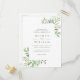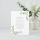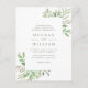 Este convite moderno para o casamento apresenta folhas verdes de aquarela e verde em uma camada com uma camada branca sobre a exibição dos detalhes da celebração em uma tipografia simples e elegante. Perfeito para casamentos botânicos temáticos.