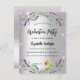 Um convite moderno e na moda. Um fundo de aparência pura prateada com brilho violeta, faíscas, flores de lavanda, flores e verde de eucalipto. Personalize e adicione o nome e os detalhes da festa.