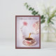 Uma xícara de chá sendo derramada com um rosa em um pequeno vaso faz um convite postal para uma festa de chá da tarde. Personalize este cartão postal com o seu local e hora!