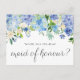 Este cartão de madrinha de casamento apresenta uma terra de cor d'água floral com hífenes azuis, rosas de marfim e sotaques verdes. Esta placa de madrinha de casamento hydrangea é perfeita para casamentos de jardim, cerimônias de primavera ou verão e temas clássicos de noiva. É uma maneira fácil e significativa de pedir a alguém especial para ficar do seu lado no seu grande dia. Adicione um nome e uma mensagem para criar um toque pessoal que ela lembrará. Quer você esteja perguntando a sua irmã, melhor amiga, ou prima, esta carta traz um belo momento para sua jornada de planejamento de casamento.