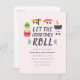 Que os bons tempos se desenrolem! Convite de festas de aniversário bonito com rolinhos de kawaii sushi contra fundo rosa pastel.