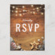 Cartão postal de RSVP de destino de praia com um fundo de celeiro de madeira rústica, luzes cintilantes, praia arenosa com uma estrela-do-mar e conchas.
