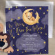 O convite para o chá do bebê "Over the Moon Teddy Bear Twinkle Little Stars" cria maravilhosamente sonhos com um toque de serenidade celestial. Apresenta uma representação aquarela de um ursinho de pelúcia em madeira numa lua crescente, rodeada por uma ligeira constelação de estrelas, capturando a essência de uma infância pacífica. O design é posicionado contra um pano de fundo azul marinho, aprimorado com uma textura de cor d'água abstrato e nuvens moles, oferecendo uma vibração tranquila e acolhedora para o seu anúncio. Perfeito para celebrar a chegada de um menino, este convite é para encantar seus convidados e estabelecer um humor mágico para o chá de fraldas.
