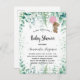 Para um chá de fraldas, comemorando uma menina. Um fundo branco. Uma menina de ursos fofinhos segurando um balão rosa, eucalipto verde e faíscas verdes. Personalize e adicione o nome da futura mãe e os detalhes da festa. O nome e o texto: Chá de fraldas são escritos com um script de estilo manuscrito