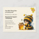 Cartão postal de convite de aniversário com uma imagem fofa. Uma garota com uma fantasia de abelha em crochê com uma abelha ao lado dela. Vendo um pote de mel.