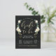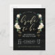 Convites de chá de panela florais elegantes, com "noiva a ser", manuscritos, com peões, rosas e folhagem de folhas de ouro, formando uma coroa ao seu redor num fundo de cor d'água escura. Perfeito para chás de panela temáticos do primavera.