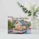Casa branca e divertida em rodas NÓS MOVEMOS cartão postal com novo endereço e aviso de casa aberta.