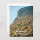 Uma fotografia de Cannon Mountain no outono. As folhas das árvores mudaram de verde para tons de laranja e amarelo. Estas cores cobriram a montanha, chegando perto do topo. O perfil da montanha são os restos da pedra granítica, onde costumava estar um rosto proeminente, como esperava e observava seu amor voltar a ele. Este dia de outono tem um céu claro e azul como fundo da cena. Em uma fonte branca é uma saudação, "Salutations du New Hampshire!" Imagem Copyright ©2024 Kimberly J Tilley. zazzle.com/store/developingnature